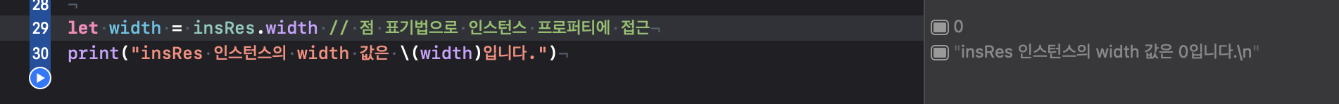 인스턴스가 생성되어야 프로퍼티에 접근이 가능하며, 프로퍼티 접근은 점 문법(Dot Syntax)를 이용하여 인스턴스 하위 객체에 접근함.