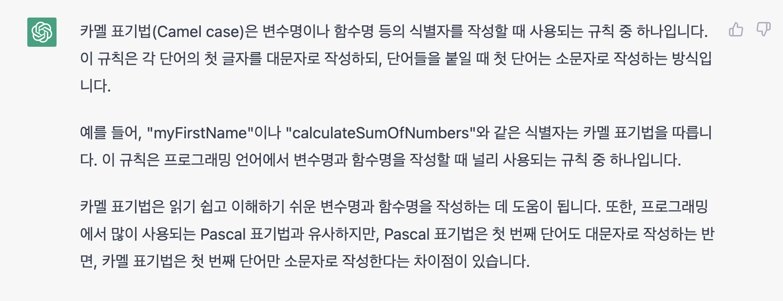 4. 프로퍼티나 메소드를 선언할 때는 소문자로 시작한다. (카멜 표기법)