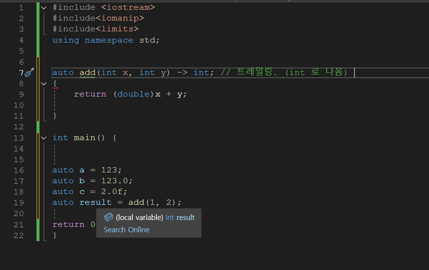 함수의 매개변수에는 auto를 못 씀. 내가 넣는 실 매개변수에 따라 함수에 들어가는 자료형이 결정되게끔 하려면 auto가 아니라 템플릿을 써야 함.