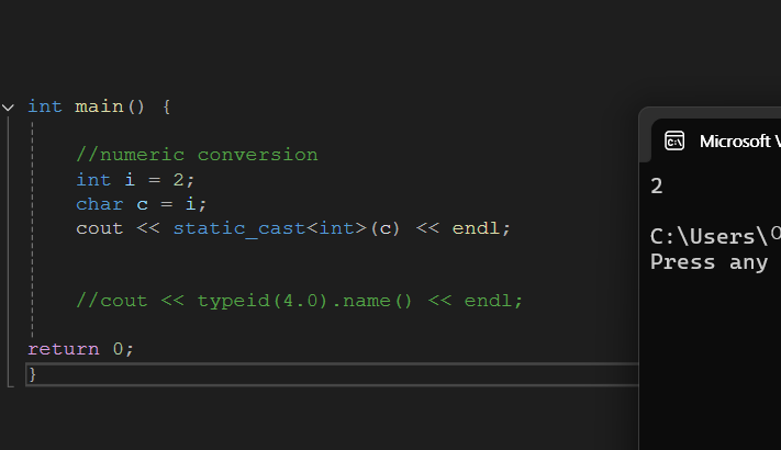 - 여러 종류의 캐스트(static_cast, reinterpret_cast, const_cast, dynamic_cast)를 모두 포함할 수 있으며, 컴파일러가 적절한 변환을 선택합니다.