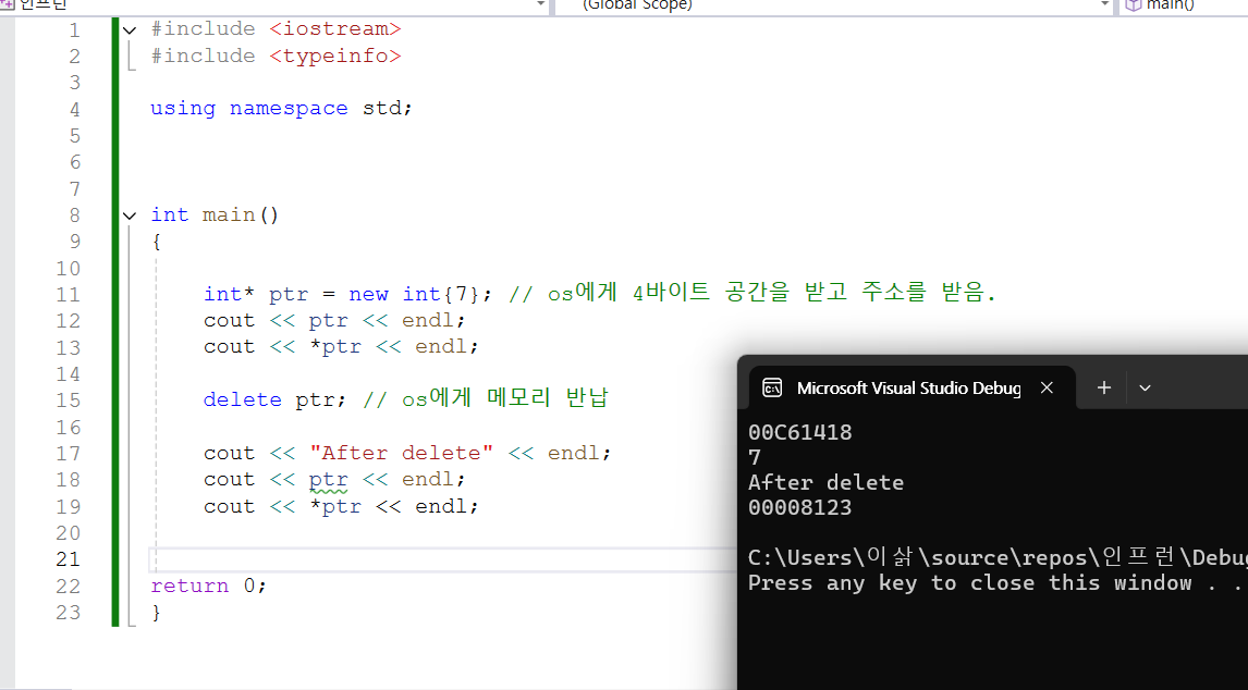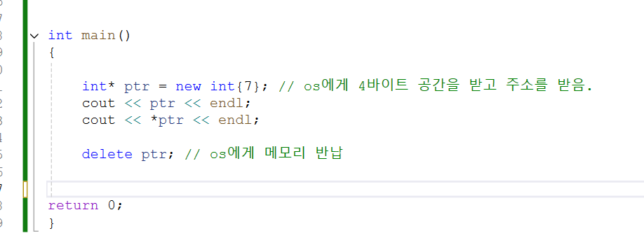 int* ptr = new int{7}; // os에게 4바이트 공간을 받고 주소를 받음.